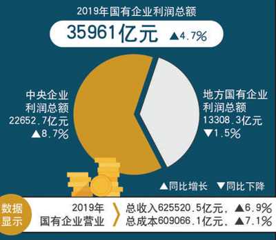 2019年,國有企業(yè)利潤(rùn)總額35961.0億元,同比增長(zhǎng)4.7%。其中,中央企業(yè)22652.7億元,同比增長(zhǎng)8.7%;地方國有企業(yè)13308.3億元,同比下降1.5%。國有企業(yè)稅后凈利潤(rùn)26318.4億元,同比增長(zhǎng)5.2%,歸屬于母公司所有者的凈利潤(rùn)15496.0億元。其中,中央企業(yè)16539.9億元,同比增長(zhǎng)10.4%,歸屬于母公司所有者的凈利潤(rùn)9644.2億元;地方國有企業(yè)9778.5億元,同比下降2.7%,歸屬于母公司所有者的凈利潤(rùn)5851.9億元。
