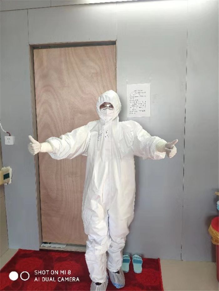 這兩天,我們已經(jīng)按照安排陸續(xù)進入病房值守。我們現(xiàn)在是4個小時一班,暫時還可以保證最基礎(chǔ)的休息。穿上防護裝備以后,大家基本認不出彼此,為了方便辨認,大家就在在防護服的背上寫上彼此的名字。