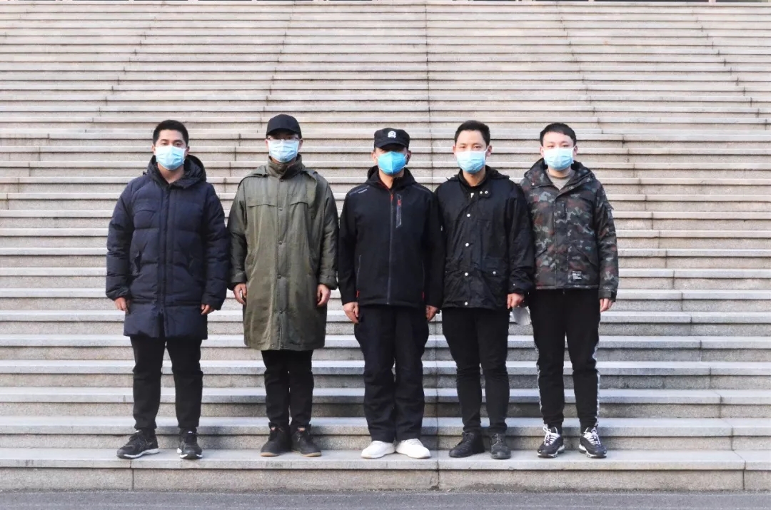 2月5日,武漢市硚口區五名干警赴武漢體育館參與搶建方艙醫院。