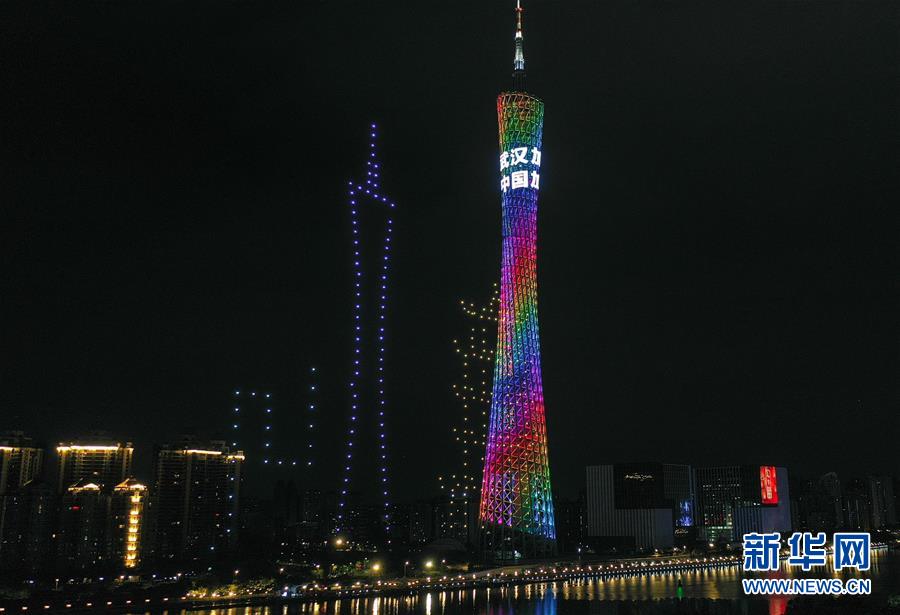 2月9日凌晨,廣州珠江上空的無人機編隊組成廣州塔和黃鶴樓圖形。 當日凌晨,無人機編隊在廣州珠江上空拼出“抗擊疫情”“武漢加油”“元宵節快樂”字樣以及廣州塔和黃鶴樓圖形等,為武漢加油。 新華社記者 劉大偉 攝
