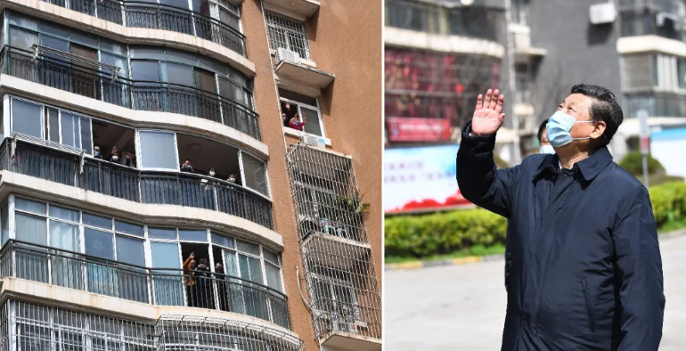 這是習(xí)近平在東湖新城社區(qū)考察時(shí),向在家隔離居住的居民揮手致意、表示慰問(wèn)。
