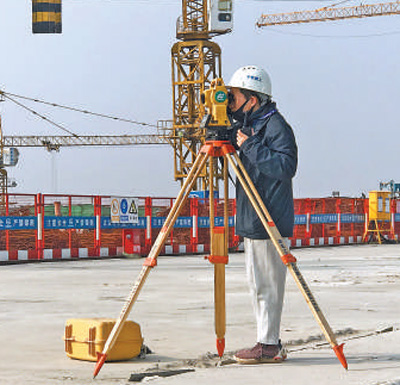 鄭州南站施工現(xiàn)場,測量員正在用全站儀進行施工點位測量。