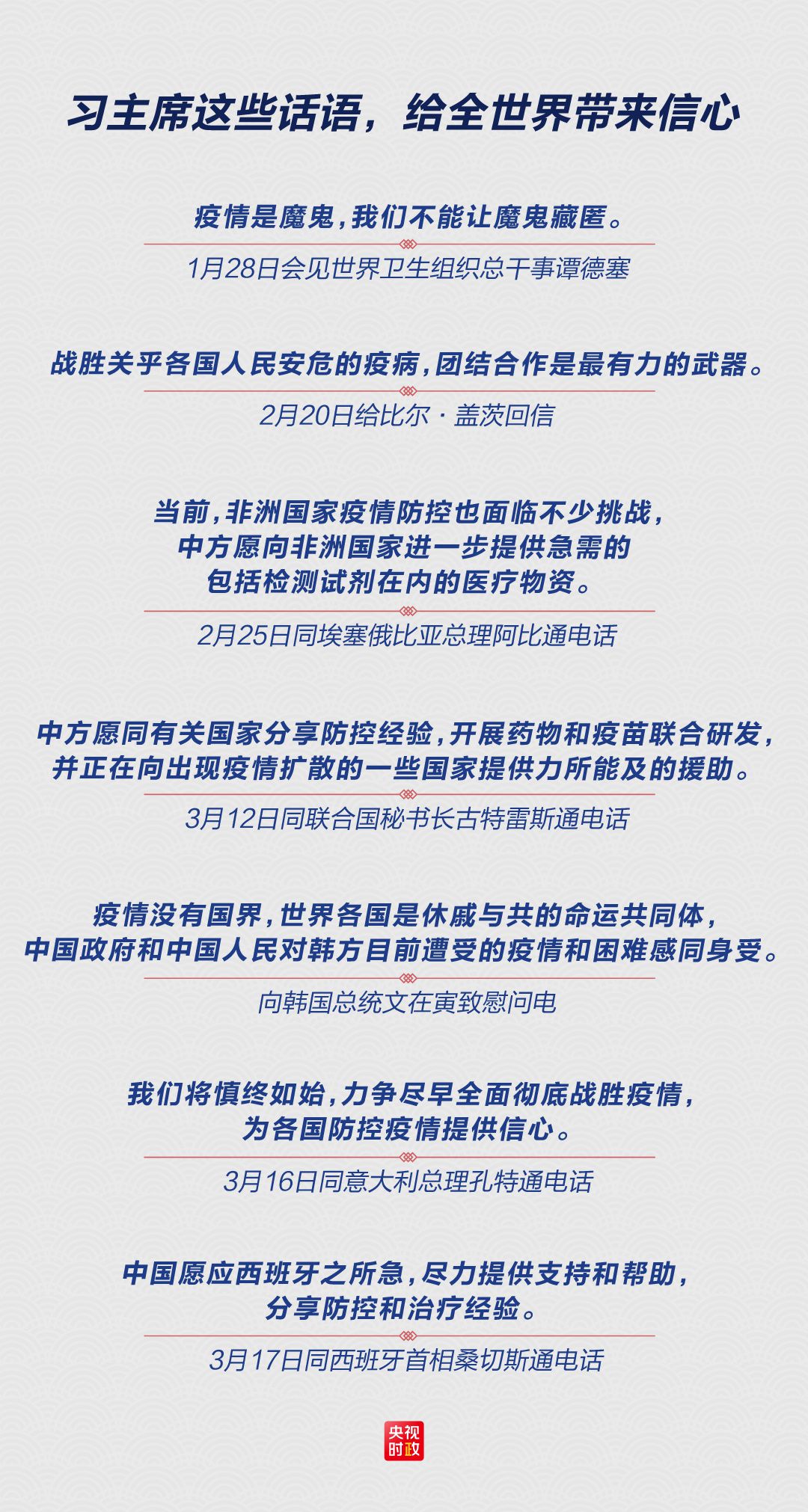 習主席說,人類是一個命運共同體,唯有團結協作才能應對各種全球性風險挑戰。疫情發生以來,中國人民在疫情防控中展現的中國力量、中國精神、中國效率,展現的負責任大國形象,得到國際社會高度贊譽,中國也得到國際社會的寶貴支持。作為同壕戰“疫”的戰友,許多外方領導人向習主席表達“硬核”支持。