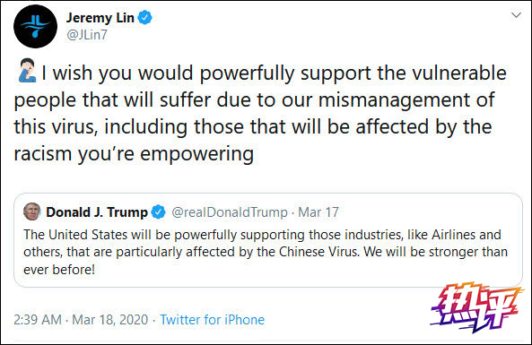 對于有網友聲稱,“在特朗普之前,所有主要媒體都將(新冠病毒)稱作‘武漢病毒’”,林書豪回擊道:“你敢說這種叫法不摻雜一絲反華情緒嗎?你敢說亞裔人士在美國沒有因此而受到不公待遇和人身攻擊嗎?把這種病毒稱作‘新冠病毒’或‘2019新冠肺炎’有那么難嗎?”