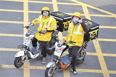 3月10日,武漢市洪山區(qū)洪山體育館外,兩位外賣小哥在這里等待取貨的客戶。本報(bào)武漢一線報(bào)道組記者 季春紅攝/光明圖片