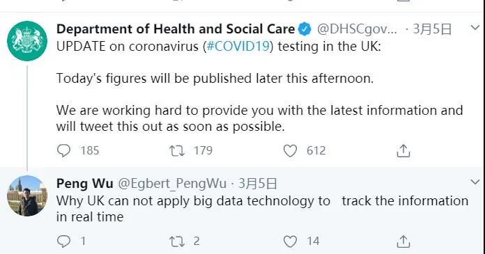 3月5日,英國衛生與社會保障部在其官方推特上發布一條貼文稱,將會努力為網友提供最新的數據。英國利茲大學留學的吳芃看到后,在底下留言發問“為什么英國不能利用大數據技術,實時跟蹤信息?”