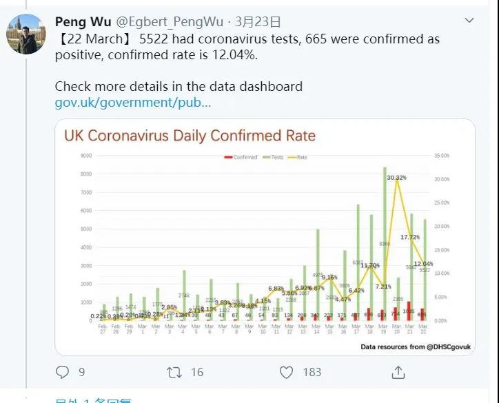 這位熱心的中國留學生,為了喚起英國民眾對疫情的注意,從3月5日起,根據英國官方數據制作相關的疫情圖表,每天一張,還都留言發布在英國衛生與社會保障部疫情通報的推文下面。