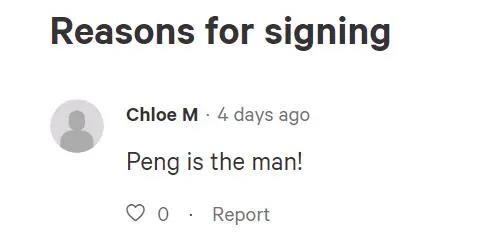 有網友寫請愿簽名的原因時說,因為“吳芃是真男人”。