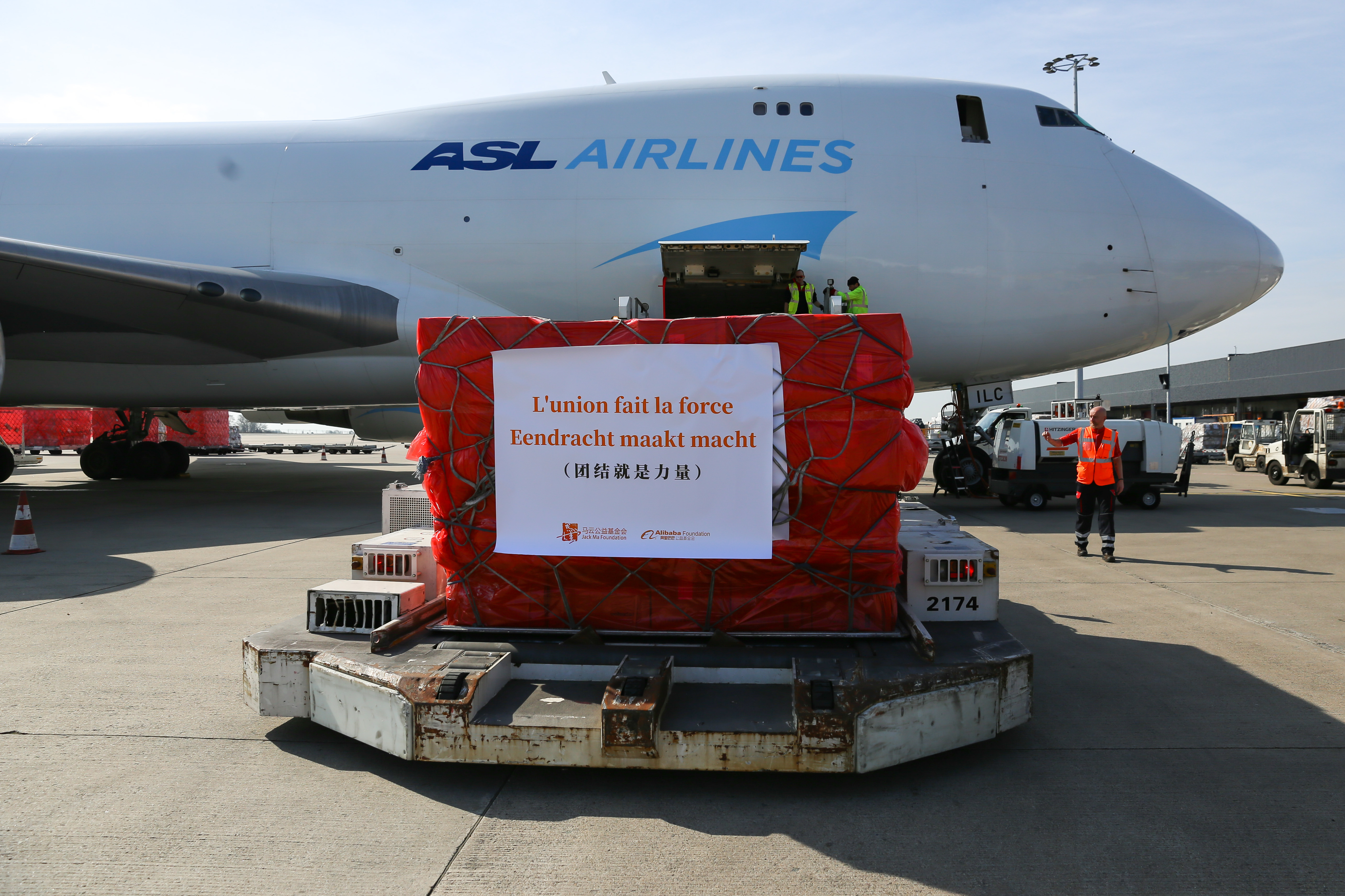 3月16日,在比利時列日機場,工作人員運送口罩包裹。來自中國的30萬只口罩當地時間16日中午運抵比利時列日機場。這是歐洲新冠肺炎疫情暴發以來,比利時首次得到大規模外來援助。這批物資由阿里巴巴公益基金會和馬云公益基金會提供。新華社記者 張鋮 攝