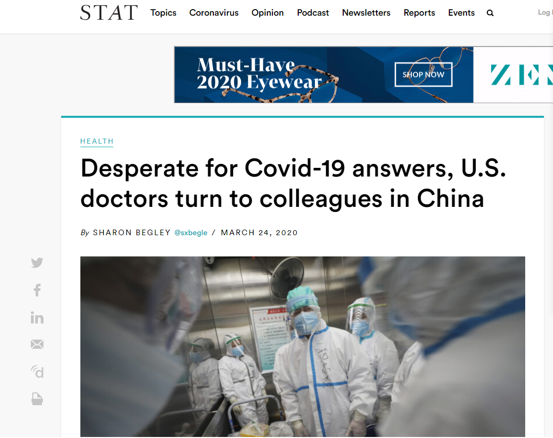 這是來自美國《波士頓環球報》旗下健康新聞網站STAT的一篇題為《渴望獲得新冠肺炎病毒信息 美國醫生求助中國的同行》的文章的開篇