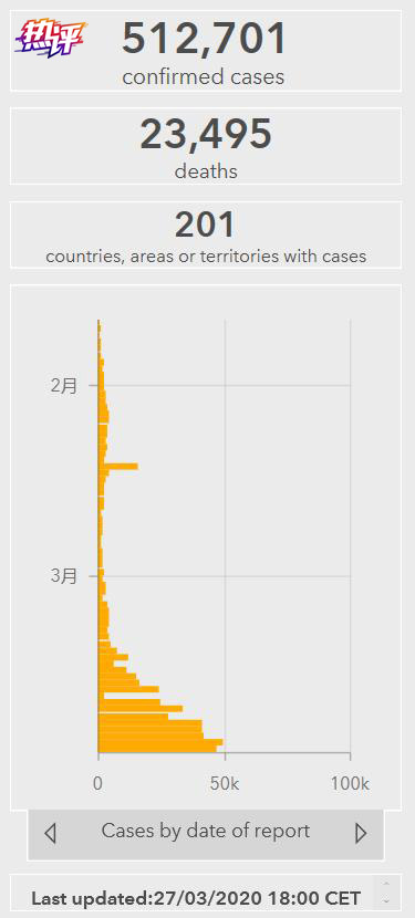 與此同時,境外疫情形勢嚴峻。世衛組織實時統計數據顯示,截至歐洲中部時間3月27日18時(北京時間3月28日1時),全球確診新冠肺炎512701例,死亡23495例,目前全球已有201個國家地區出現新冠肺炎病例,中國以外新冠肺炎確診約43萬例。