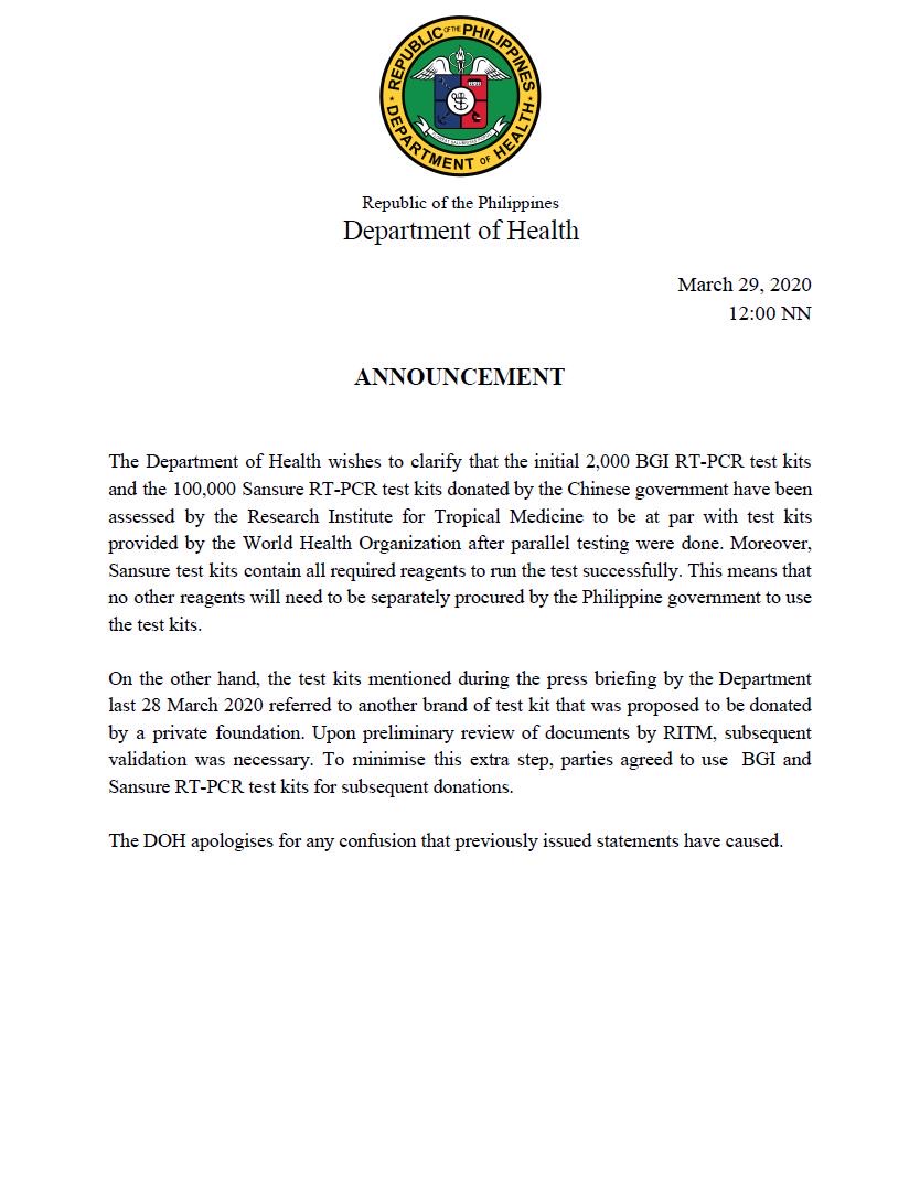 3月29日,菲律賓衛(wèi)生部發(fā)布公告,對有關(guān)中國援菲新冠肺炎檢測試劑質(zhì)量的事宜作出澄清。