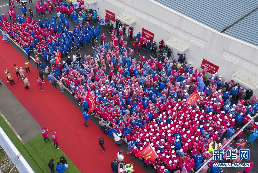 3月29日,醫護人員參加在武漢雷神山醫院舉行的集中撤離儀式(無人機照片)。 當日,武漢雷神山醫院舉行首批外省醫療隊集中撤離儀式,送別即將踏上歸途的遼寧、上海、吉林、廣東、山西、河北醫療隊的1090名醫護人員。 新華社記者 才揚 攝