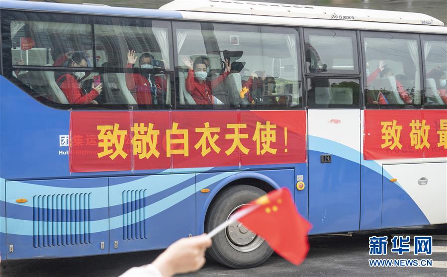 3月31日,在武漢市洪山區駐地,青島大學附屬醫院醫護人員揮手告別。 當日,山東省第七批醫療隊的青島大學附屬醫院132名醫護人員在圓滿完成任務后,離開武漢啟程回家,他們負責武漢同濟醫院光谷院區的一個新冠肺炎重癥病區。 新華社記者 才揚 攝
