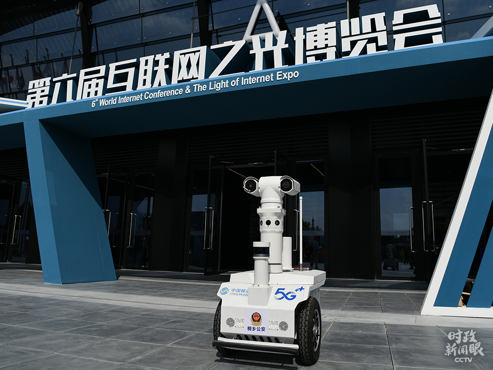 △這是“互聯網之光”博覽會展館前的5G警用機器人。