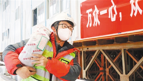 中建三局基建投公司雷神山醫院項目建設者匡文博在現場搬運物資。(資料照片)