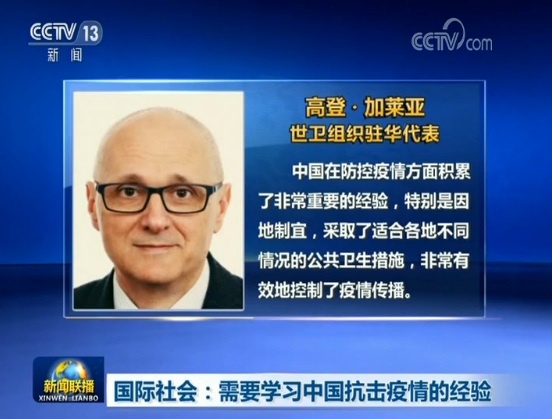 世衛組織5日的報告援引世衛組織駐華代表高登·加萊亞的話說,中國在防控疫情方面積累了非常重要的經驗,特別是因地制宜,采取了適合各地不同情況的公共衛生措施,非常有效地控制了疫情傳播。加萊亞表示,中國人民為遏制疫情傳播做出巨大努力,產生積極成效。各國應共同協作分享抗疫經驗和疫情信息,互相借鑒學習,采取及時有效的防控措施。