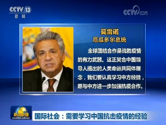 厄瓜多爾總統莫雷諾表示,全球團結合作是戰勝疫情的有力武器。這正契合中國領導人提出的人類命運共同體理念,我們要認真學習中方經驗,愿與中方進一步加強抗疫合作。