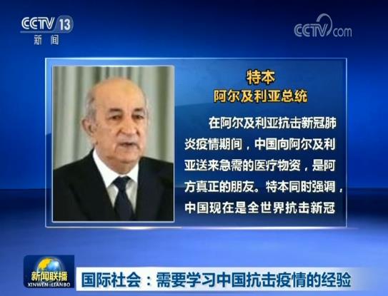 阿爾及利亞總統特本表示,在阿爾及利亞抗擊新冠肺炎疫情期間,中國向阿爾及利亞送來急需的醫療物資,是阿方真正的朋友。特本同時強調,中國現在是全世界抗擊新冠肺炎疫情中少數有能力為其他國家提供醫療援助和支持的力量。