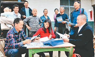 3月26日,湖北省十堰市鄖陽區(qū)白桑關(guān)鎮(zhèn)梅子營村村民尤爾霞(前中)在家門口領(lǐng)到了農(nóng)商行信貸員送來的10萬元貸款,計(jì)劃種植兩個(gè)大棚食用菌。