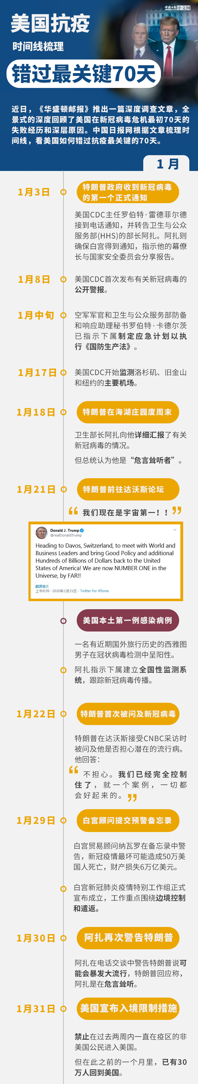 近日,《華盛頓郵報》推出一篇深度調查文章,全景式的深度回顧了美國在新冠病毒危機最初70天的失敗經歷和深層原因。中國日報網根據文章梳理時間線,看美國如何錯過抗疫最關鍵的70天。