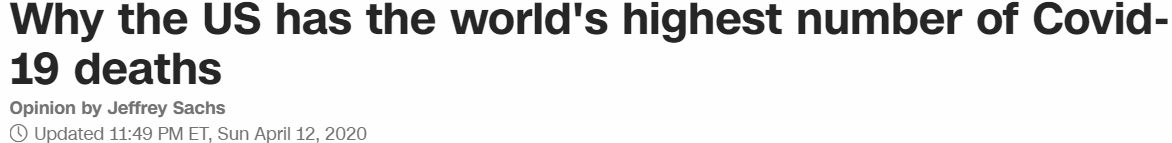 當地時間4月12日,美國主流媒體CNN發表哥倫比亞大學著名經濟學教授杰佛瑞·薩科斯的評論文章《為何美國Covid-19死亡人數居世界首位》,認為如果特朗普政府再不拿出一個完整、連貫的應對方案,美國將會“繼續出現大量死亡”;而且,美國對中國和對世衛組織的攻擊,完全是為了“轉移目標”。