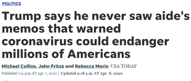 薩科斯教授在文中指出,近日的多家媒體報道都表明,美國早在今年初便收到了來自各方的疫情警告——美國情報機構1月初就發出了警告,中國疾控中心主任1月3日也親自致電美國疾控中心主任發出了警告,特朗普白宮顧問彼得·納瓦羅1月28日同樣向總統提交了緊急備忘錄。然而三個月過去了,如今面對媒體疑問,特朗普卻表示“我從來沒見過這些報告和備忘錄”。 薩科斯教授不無諷刺地寫道:“在這點上,我相信特朗普。除了集會、真人秀電視發布會,還有高爾夫球賽,特朗普都是缺席總統。”