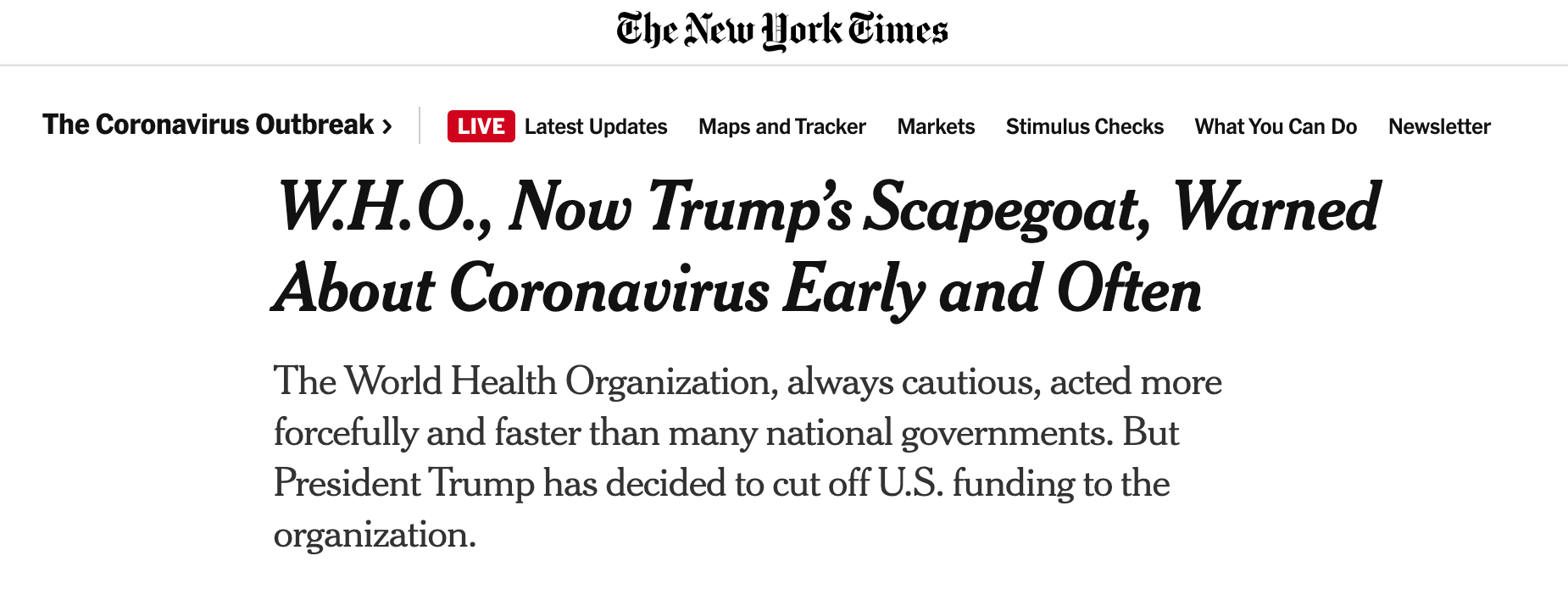 16日,《紐約時報》發文稱:世衛組織是特朗普尋找的“替罪羊”,該組織向來謹慎,其行動比許多國家政府更有力、更快速。