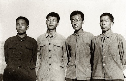 1973年,習近平和延川縣北京知青雷平生(左一)、陶海粟(右二)、雷榕生(右一)在縣城“三間房”前合影。圖片來源:新華社 谷溪 攝