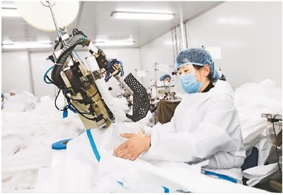 淮安經濟技術開發區內,企業工人在生產防護服。