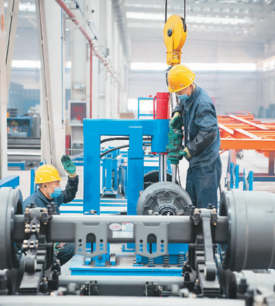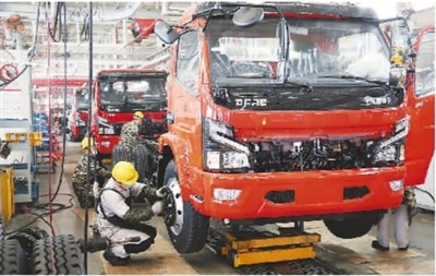 5月3日,位于湖北省襄陽市的東風汽車股份有限公司工程車事業部二總裝車間里一派熱火朝天的景象,為趕生產任務,工程車事業部每天排產近100臺,達同期產能水平150%。圖為裝配工人正在緊張地忙碌。王 虎攝(人民視覺)