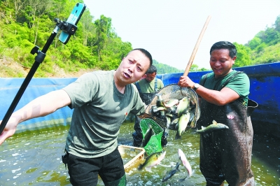 ②江西宜春市上高縣翰堂鎮(zhèn)江邊村漁業(yè)產(chǎn)業(yè)扶貧基地,第一書記楊偉(左一)在直播銷售鱸魚。周亮攝