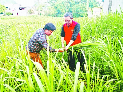 ③廣西平果縣太平鎮(zhèn)吉林村第一書記劉啟強(右一)幫助群眾收割牛草。