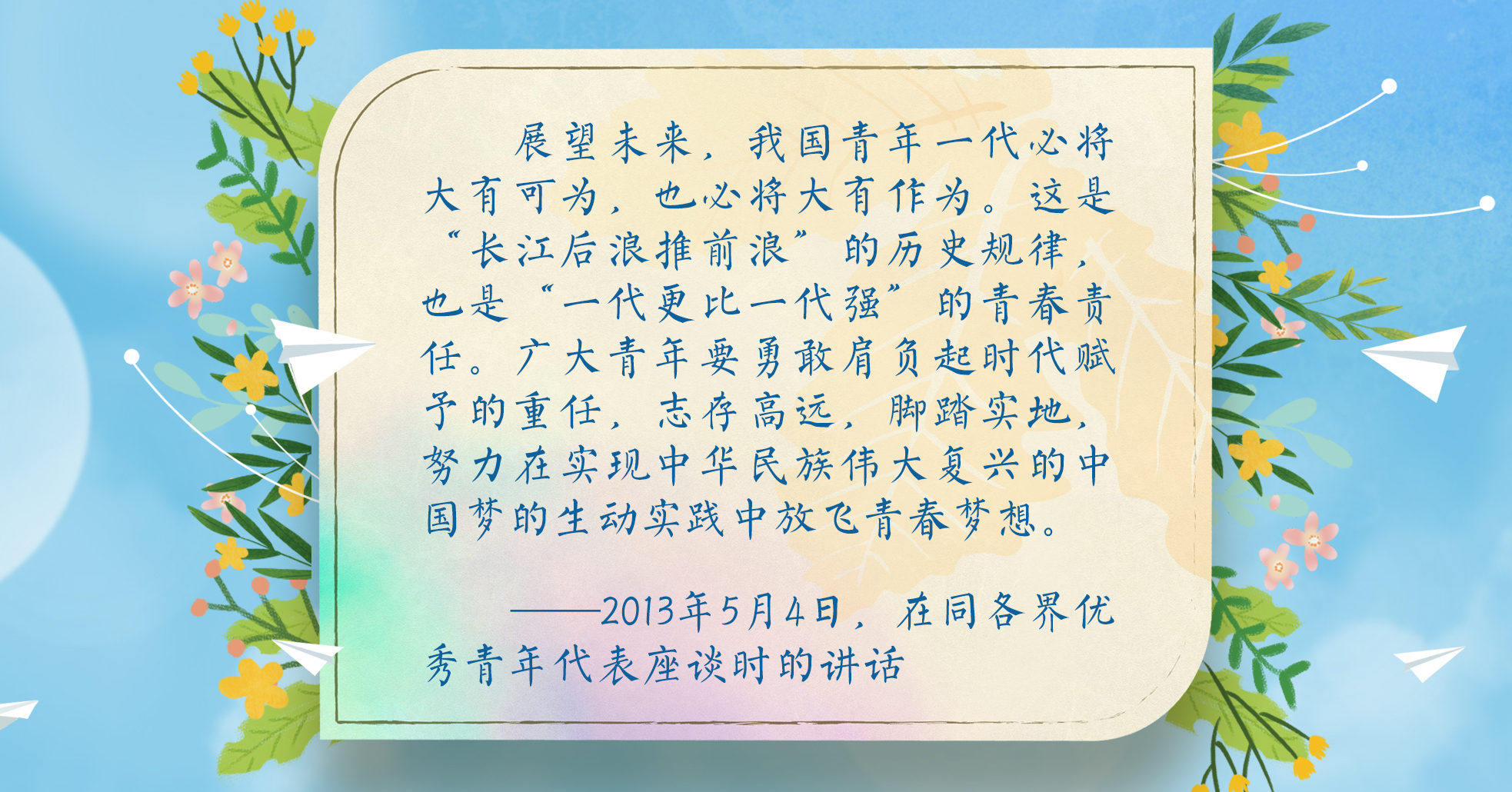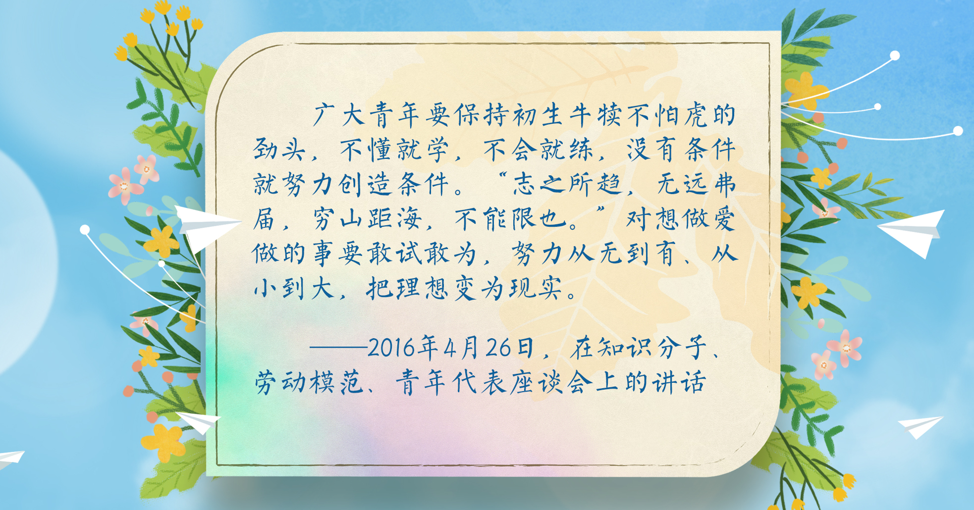 青年是祖國的未來、民族的希望。習近平總書記一直以來都十分重視青年工作,他常常鼓勵青年追求夢想、努力奮斗。“青年最富有朝氣、最富有夢想”“好兒女志在四方,有志者奮斗無悔”“中華民族偉大復興終將在廣大青年的接力奮斗中變為現實”。總書記的諄諄教誨猶如一本成長指南,引領新時代青年走好人生之路。