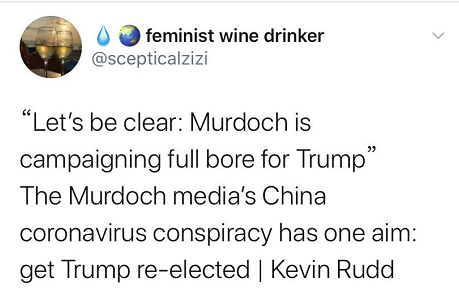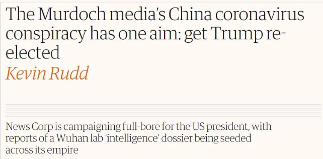 △陸克文撰文《默多克新聞集團(tuán)關(guān)于中國的新冠病毒陰謀只有一個(gè)目的:讓特朗普連任》