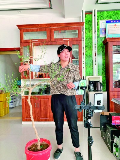 王航弟在家里放了一盆枸杞盆栽,以方便在直播時(shí)向一些沒見過枸杞樹的顧客展示。光明日?qǐng)?bào)記者 王建宏攝