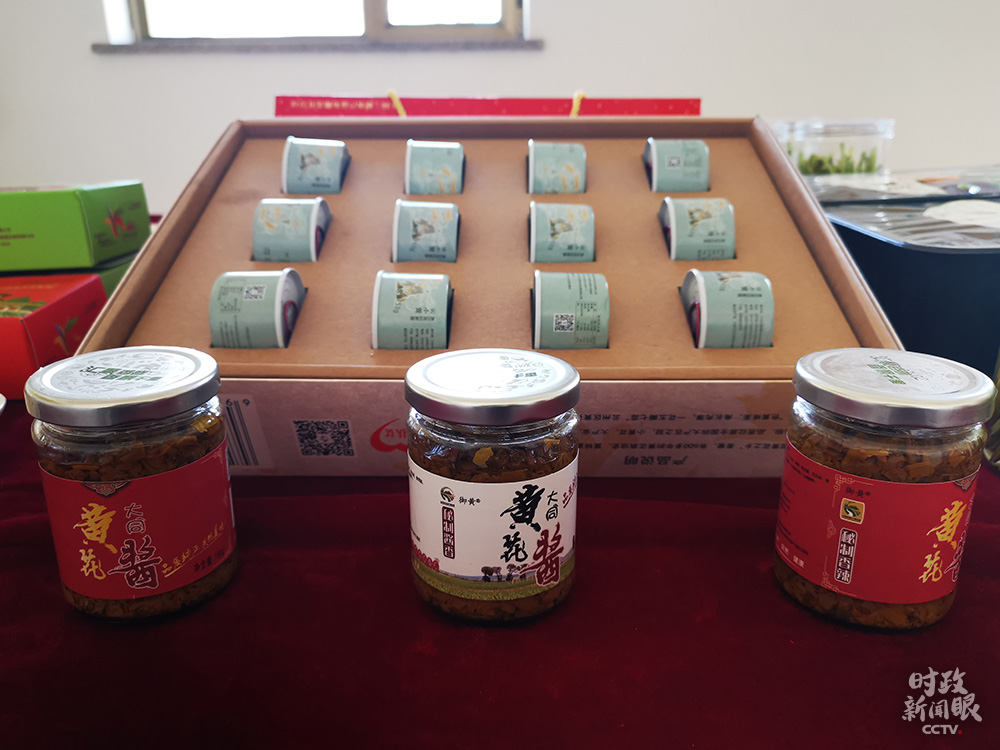 △以黃花為原材料制作的黃花餅、黃花醬、真空凍干黃花。(總臺央視記者張曉鵬拍攝)