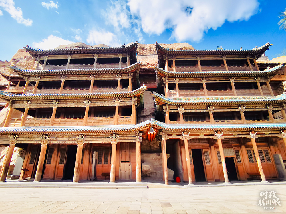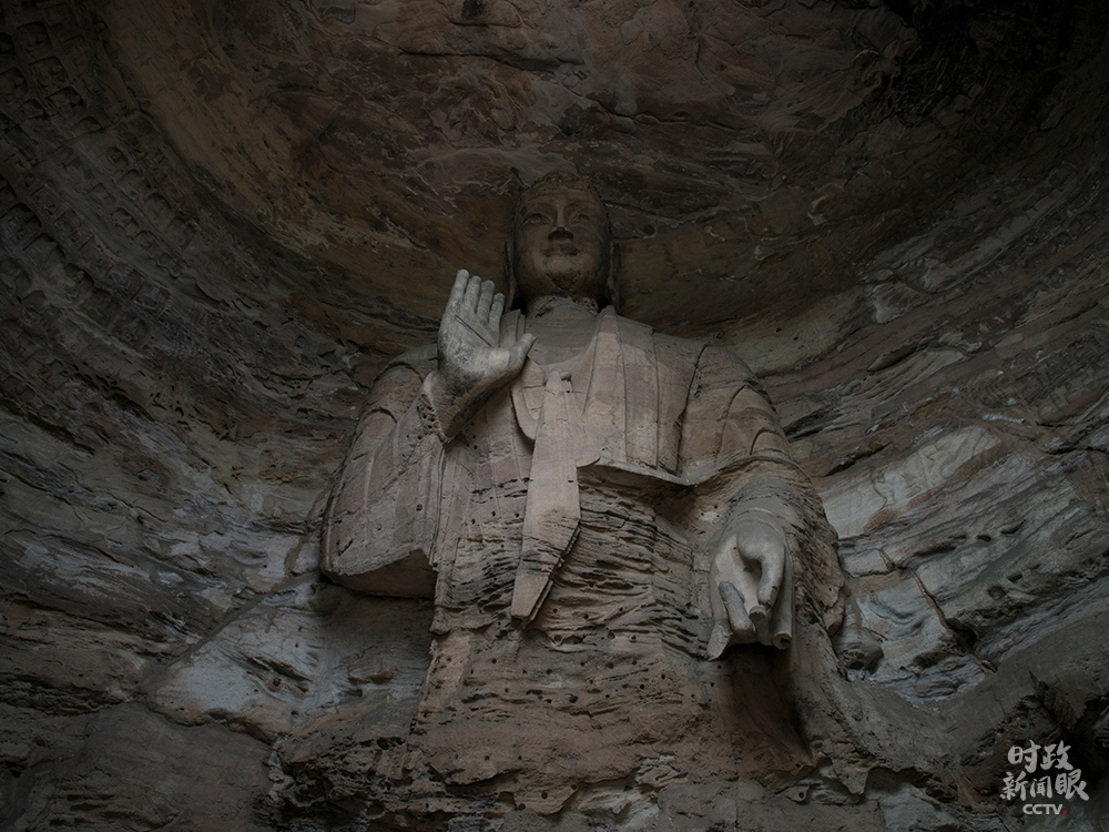 △第5、6窟是工程浩大、雕飾華麗的典型洞窟。窟前四層木質(zhì)樓閣為清順治八年(1651年)所建。第5窟主像是云岡石窟第一大佛,坐佛高17米。(總臺央視記者李輝、楊波拍攝)