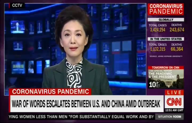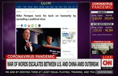 美國有線電視新聞網國內頻道(CNN)和美國有線電視新聞網國際新聞頻道(CNN International)僅5月1日至3日就連續三天共九次報道稱,本周中國中央電視臺幾乎每天播發評論抨擊美國國務卿蓬佩奧對中國的指責,其中有一篇評論指出,“散播‘政治病毒’的蓬佩奧正把自己變成人類公敵。”