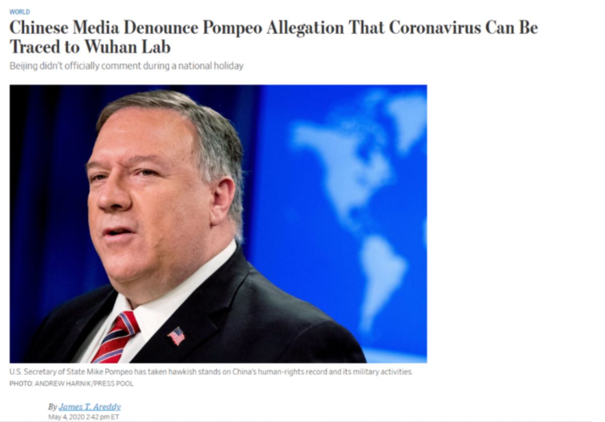 美國《華爾街日報》網站5月4日刊發文章稱,美國國務卿蓬佩奧變本加厲地指控新冠病毒疫情可以追溯至中國的實驗室,引發中國媒體憤怒回應。