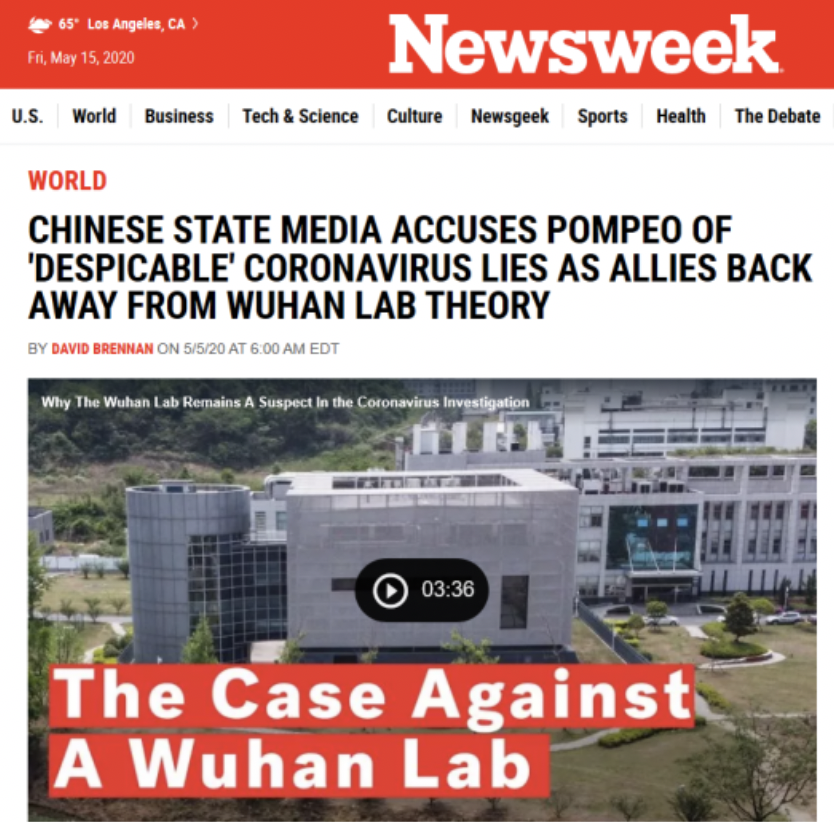 美國《新聞周刊》網站5月5日發表題為《中國官方媒體指責蓬佩奧“卑鄙的”冠狀病謊言》的報道。報道稱,蓬佩奧聲稱看到“大量證據”證明該病毒與疫情有關,中國國家媒體憤怒回應了針對該國應對疫情不力以及武漢病毒研究所與疫情有關的指控。