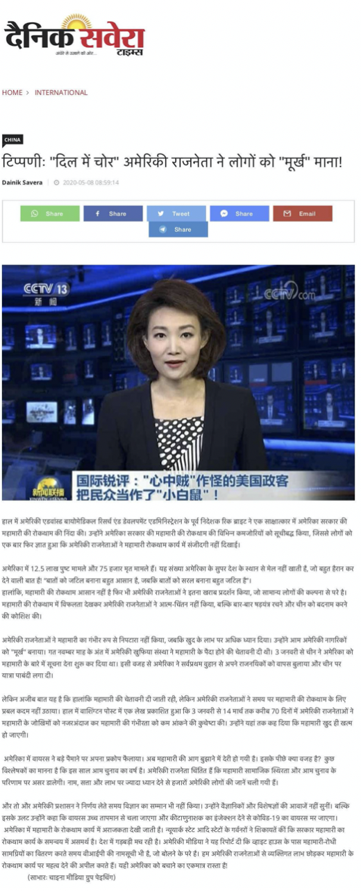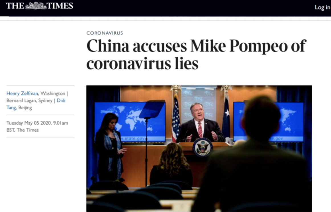 英國《泰晤士報》5月5日發表題為《中國指責蓬佩奧有關新冠病毒的謊言》的報道稱:“中國指責蓬佩奧有關新冠病毒的謊言。中央電視臺指責蓬佩奧用‘神經錯亂的說辭’在‘噴毒造謠’。”