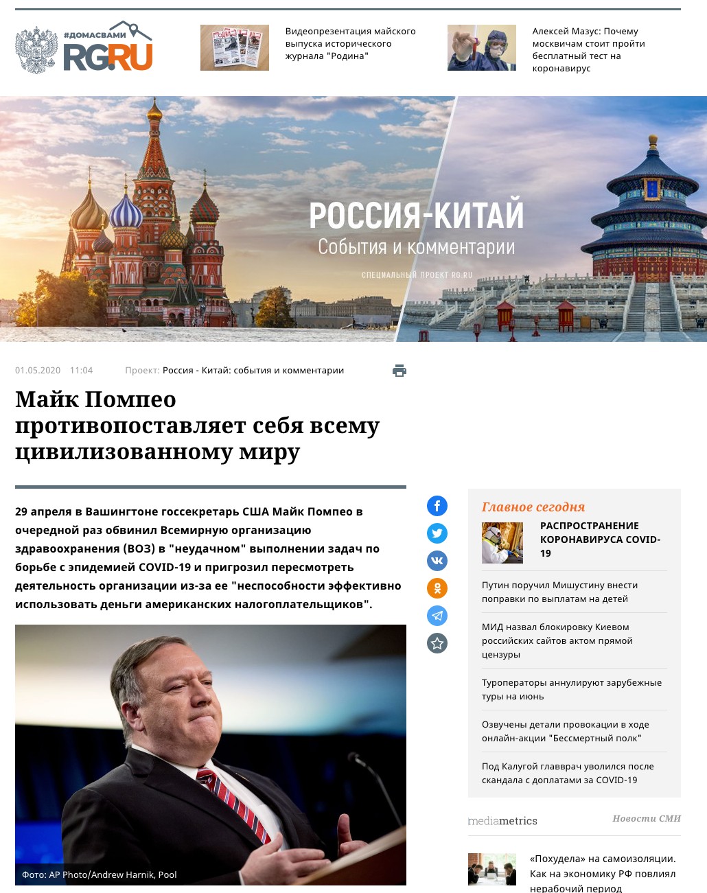 俄羅斯最具權威性和影響力的國家政府機關報《俄羅斯報》官網5月1日發表題為《蓬佩奧與全世界對抗》的文章。文章稱,在美國疫情確診人數突破百萬的危急時刻,蓬佩奧不是集中精力為搶救美國公民生命而奔波,而是企圖對世衛組織搞政治脅迫,公然站到了全世界的對立面。