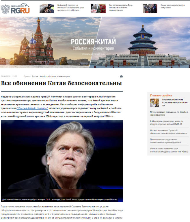 《俄羅斯報》官網5月4日發表題為《所有針對中國的指責都毫無根據》的文章稱,美國極右民粹分子史蒂夫·班農在接受媒體采訪時詆毀中國抗疫模式,妄稱中國要對這場流行病承擔經濟責任。在美國新冠肺炎確診病例突破百萬、一季度經濟創國際金融危機以來最大跌幅背景下,班農將責任歸咎中國,毫無道德廉恥。