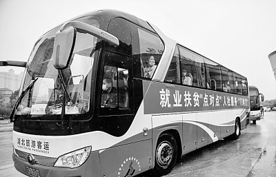 五月十四日,湖北、山東完成《鄂魯支持貧困勞動力外出務工暨勞務協(xié)作幫扶協(xié)議》簽約。圖為即將赴魯就業(yè)的湖北務工人員乘坐大巴車從黃岡出發(fā)。新華社記者 程敏攝