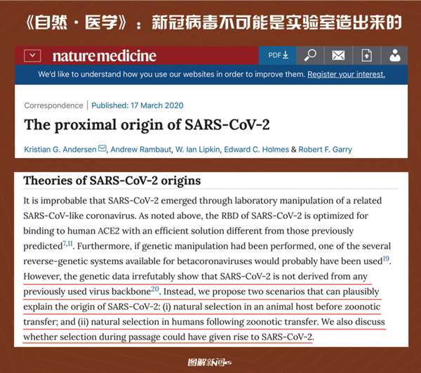 2020年3月17日,《自然·醫學》雜志刊發美國、英國、澳大利亞5位權威科學家的研究論文證明,新冠病毒不可能是實驗室造出來的,可能是病毒對人或動物宿主的自然選擇。 人民網供圖 王政淇/制圖