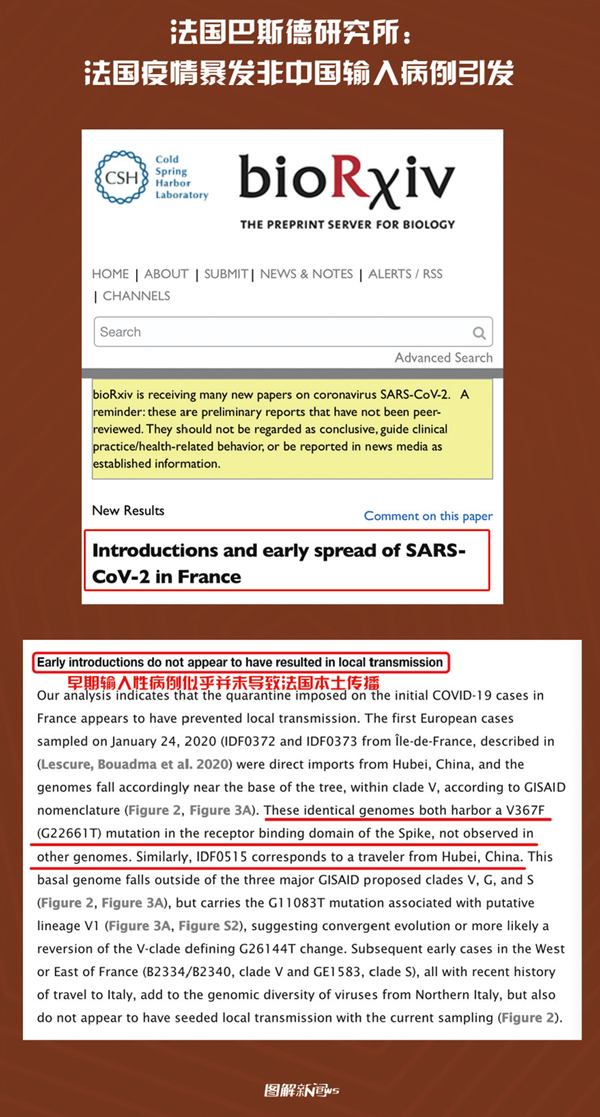 2020年4月29日,法國巴斯德研究所在其網站上預發表的一篇論文,將法國檢測到的97個新冠病毒樣本與全球共享流感數據倡議組織(GISAID)發布的338份新冠病毒序列進行比對和溯源分析。研究發現,法國流行的新冠病毒和1月發現的中國輸入病例感染的病毒并非來自同一毒株。這說明,導致法國本地疫情暴發的病毒并非來自中國。 人民網供圖 王政淇/制圖