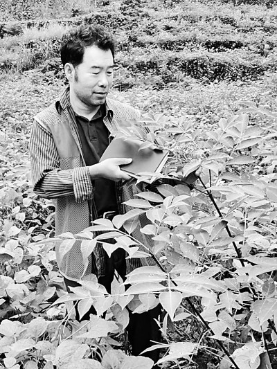 莊寧斌在查看開(kāi)始掛果的吳茱萸。譚秀輝攝/光明圖片