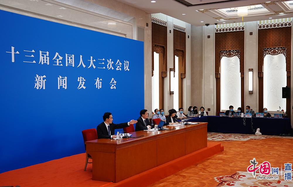 5月21日21時40分,十三屆全國人大三次會議在人民大會堂新聞發布廳舉行新聞發布會,圖為大會發言人張業遂回答記者提問。中國網記者 楊佳 攝