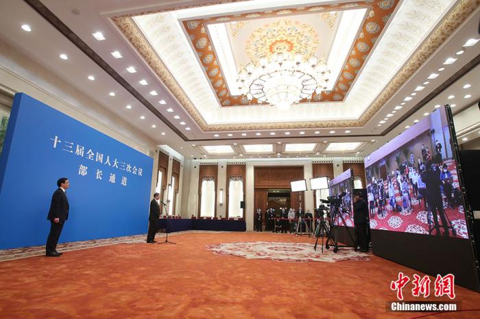 5月22日,第十三屆全國(guó)人民代表大會(huì)第三次會(huì)議在北京人民大會(huì)堂舉行首場(chǎng)“部長(zhǎng)通道”采訪活動(dòng)。圖為國(guó)家發(fā)展和改革委員會(huì)主任何立峰通過(guò)網(wǎng)絡(luò)視頻方式接受采訪。 中新社記者 韓海丹 攝